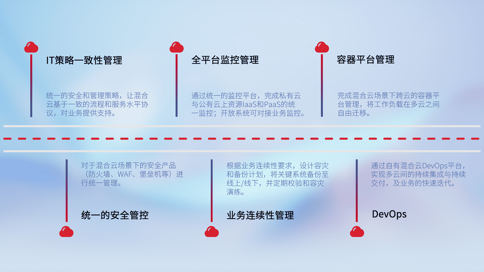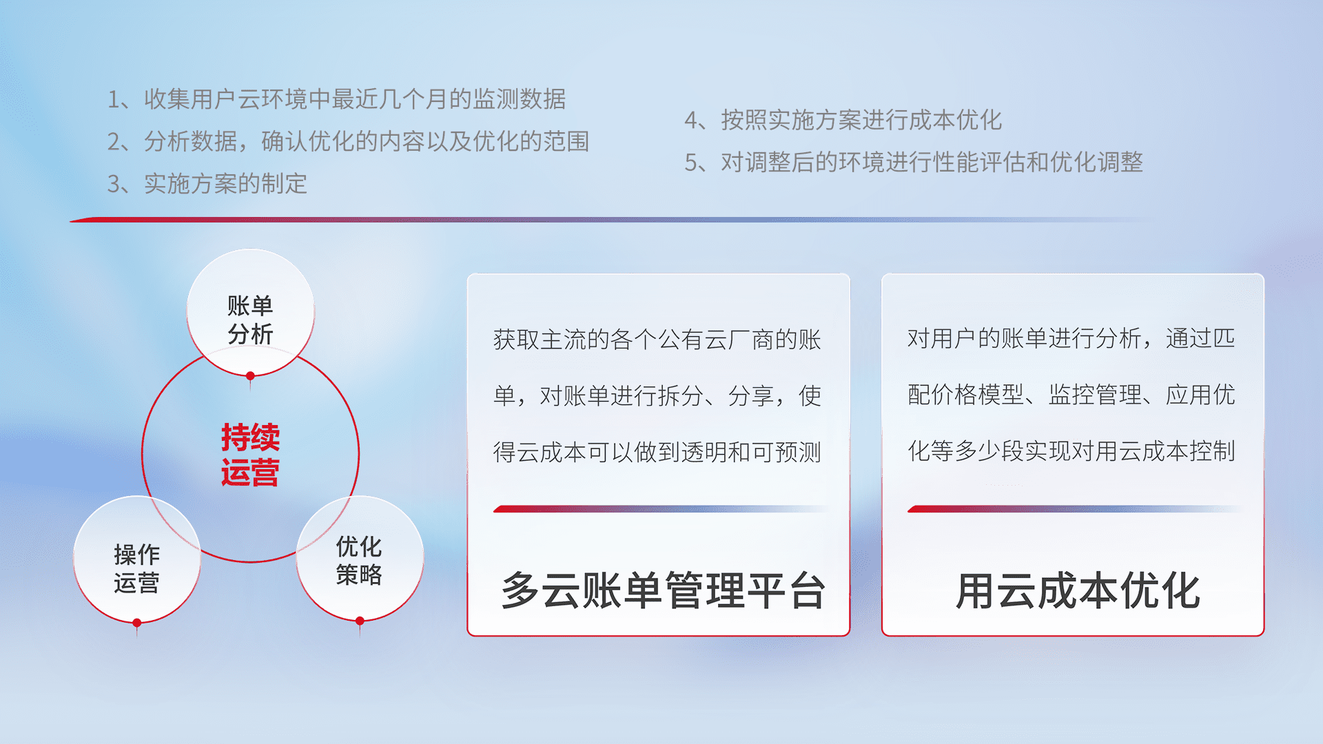 通过多云纳管,,,,以统一的资源数据模型把客户的云资源进行抽象和封装,,,,进而实现对多云资源的统一操作,,,保障云资源管理的可靠性、、、稳定性与可用性。。。量身定制化运维内容,,配置、、、开发运维、、补丁管理、、、备份、、、、监控、、认证和访问管理、、、、审计和日常巡检等,,,,保障在用云过程中的可靠度,,,,稳定度以及高可用率。。