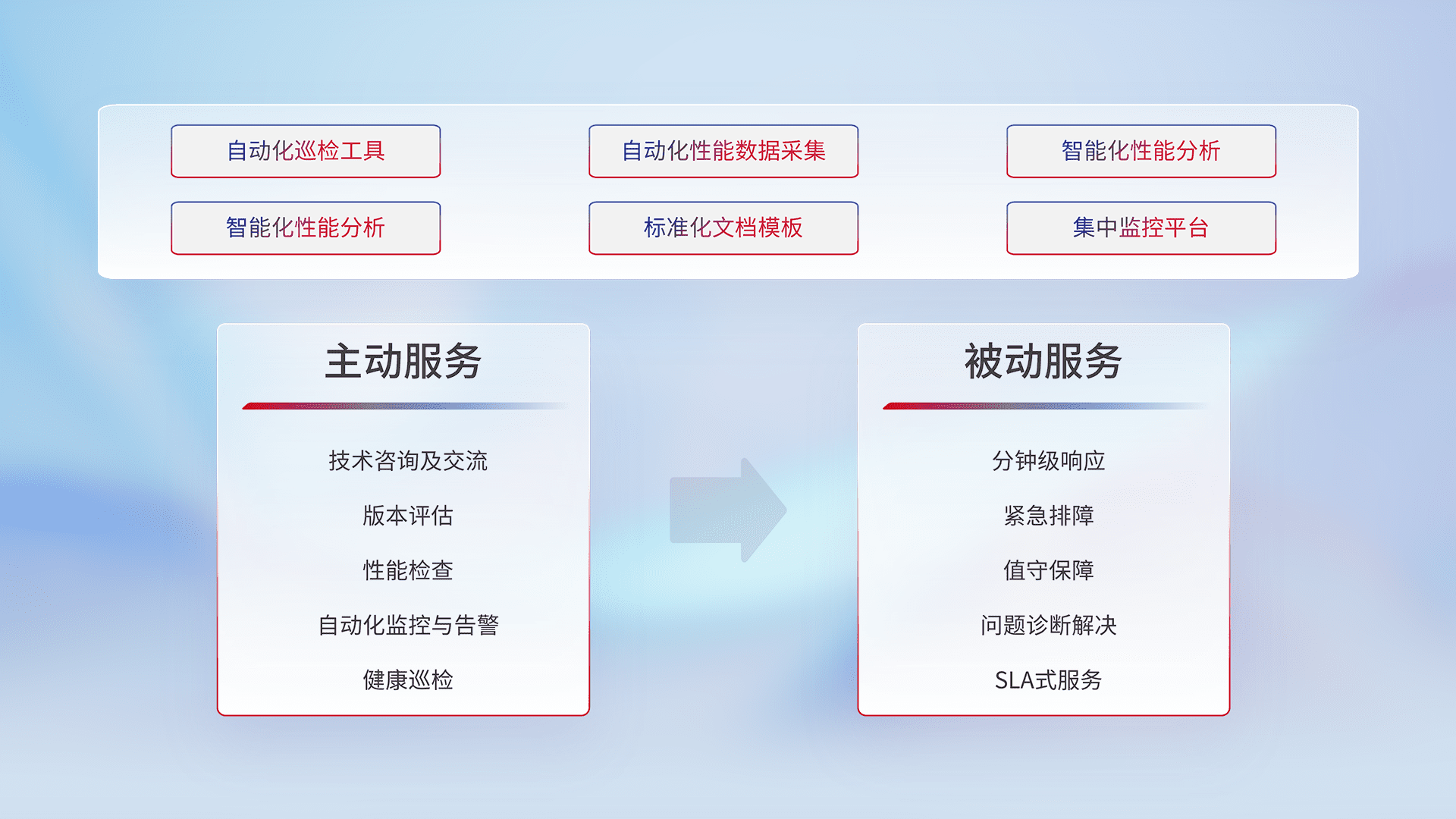 智能化工具和标准化文档,,,,保障服务质量,,,,提供主动服务(包含技术咨询、、、版本评估、、性能检查、、、自动化监控与告警、、、健康巡检)和被动服务包含(分钟级响应、、紧急排障、、、、值守保障、、问题诊断解决、、、SLA服务)。。。