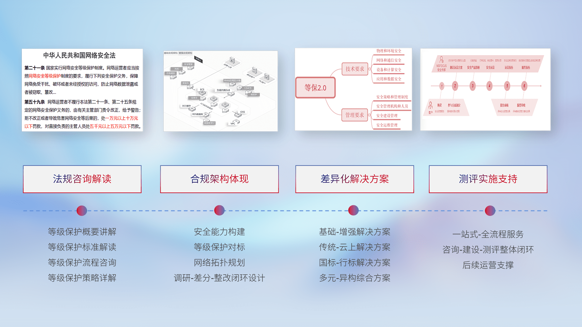通过专业的法律咨询解读、、合规架构体现、、、、差异化解决方案、、测试实施支持等服务,,,为客户量身打造等保合规体系。。